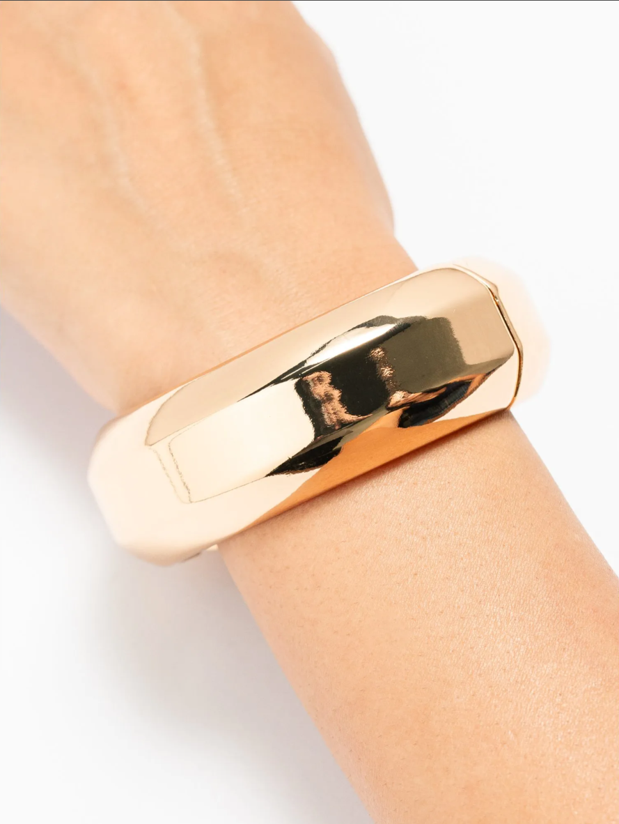 Com acabamento polido e folheado em ouro 18K, ele combina curvas delicadas nas laterais com um centro levemente reto, criando um visual moderno, sofisticado e cheio de presença. O brilho intenso valoriza o pulso e torna a joia ideal para quem busca estilo e elegância no dia a dia.