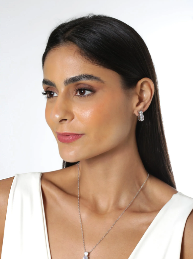 Conjunto de Colar e Brincos com Zircônias Redondas Cristais – Folheado em Ródio Branco
