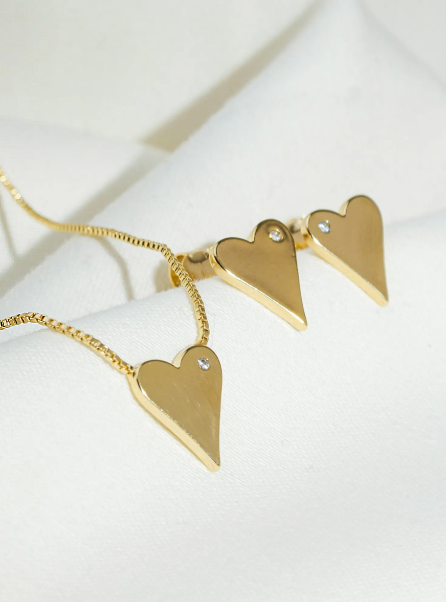 Conjunto de Colar e Brincos de Coração Liso e Ponto de Luz – Folheado em Ouro 18K