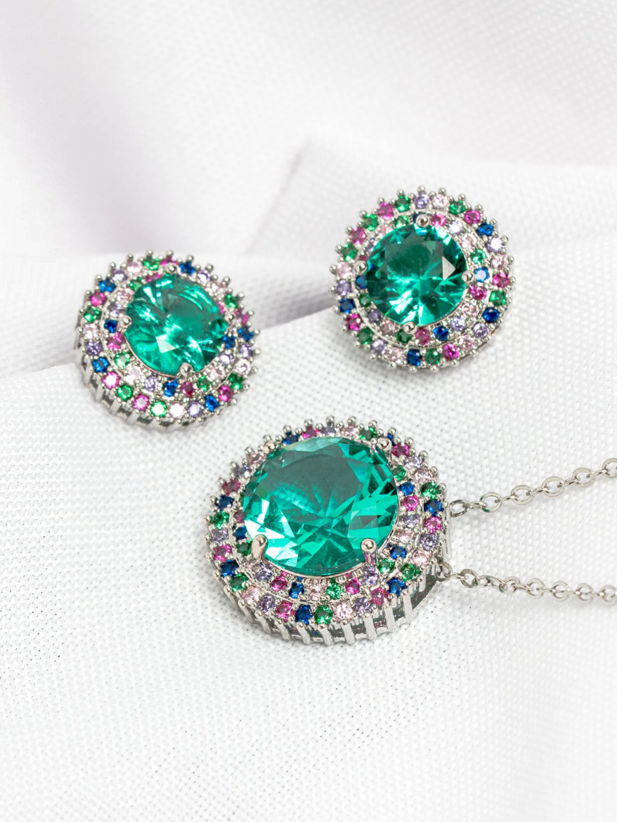 Conjunto de Colar e Brincos Maxi Redondos com Zircônias Coloridas e Pedra Verde Esmeralda folheado em ródio branco