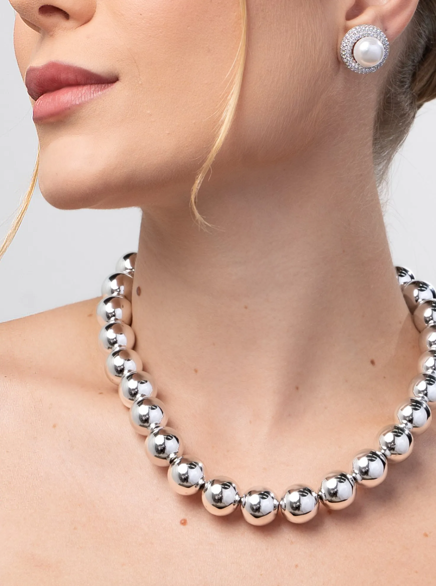 Mix Essência Ródio – Colar de Esferas e Brincos com Pérola Central